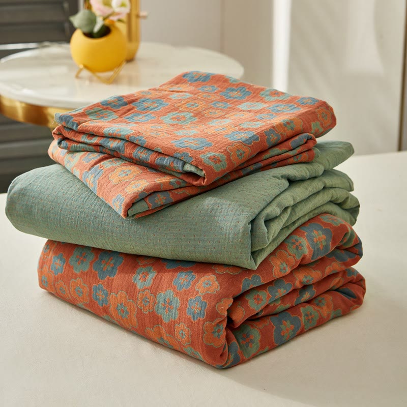 Reversible design with colorful floral print and bright color options allow you to change the look of your room in an instant. Made from double-layer cotton gauze. this quilt is soft and cozy. providing warmth. Reversible double-sided design. which adds reliable strength for use and wash. Adopted with reactive printing and jacquard technology. This quilt is suitable as a daily blanket for summer or a bedsheet on your bed. It also can be used as an air conditioning blanket. airplane blanket. bedside towel. sofa blanket. or shawl blanket. Pillowcase is made for zipper design. not easy to loosen with pillow.