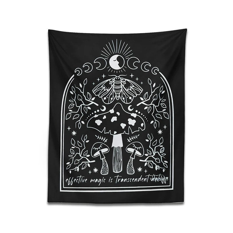 Schwarz-weißer Wandteppich mit Nachtfalter-Pilz, Sonne und Mond. Perfekt zum Aufhängen an der Decke über dem Bett oder an jeder anderen Wand Ihres Zimmers. Wandteppiche können Ihr Zimmer im Handumdrehen verändern! Leicht zum Aufhängen an Wand oder Decke und strapazierfähig für den Einsatz als Outdoor-Decke oder Tischdecke.