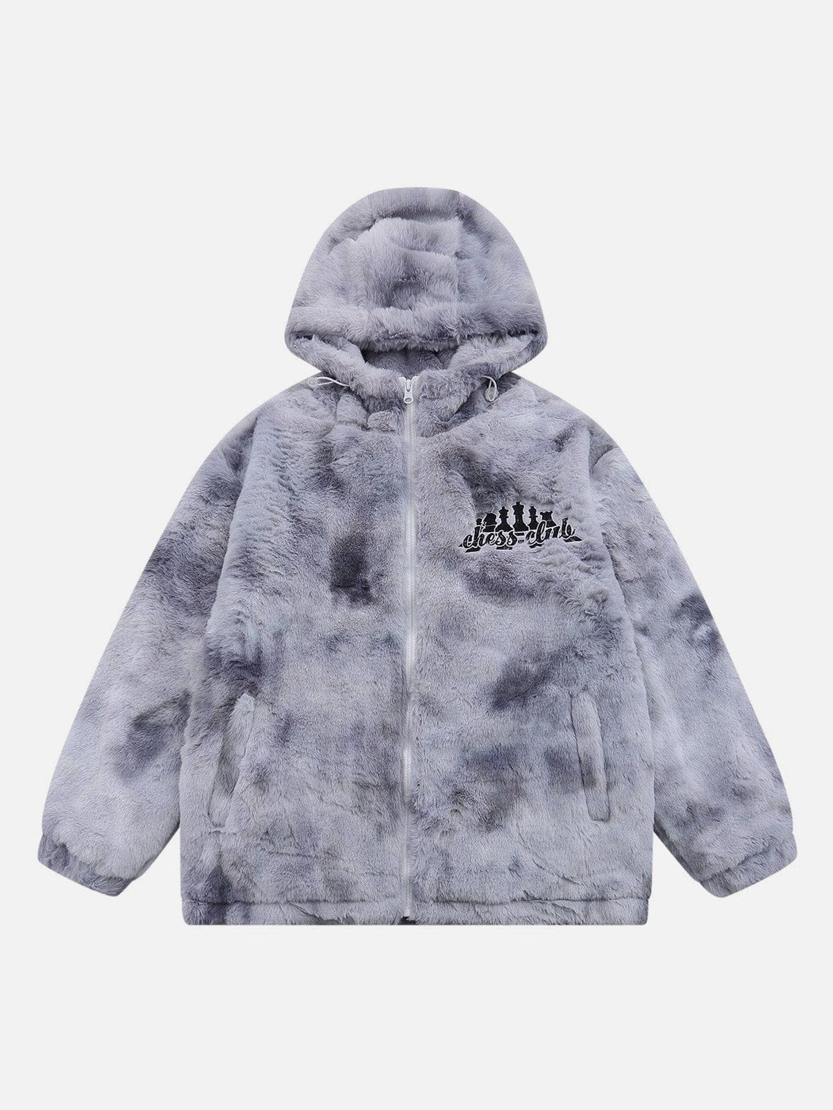 Wintermantel mit gestickten Schachfiguren und Buchstaben