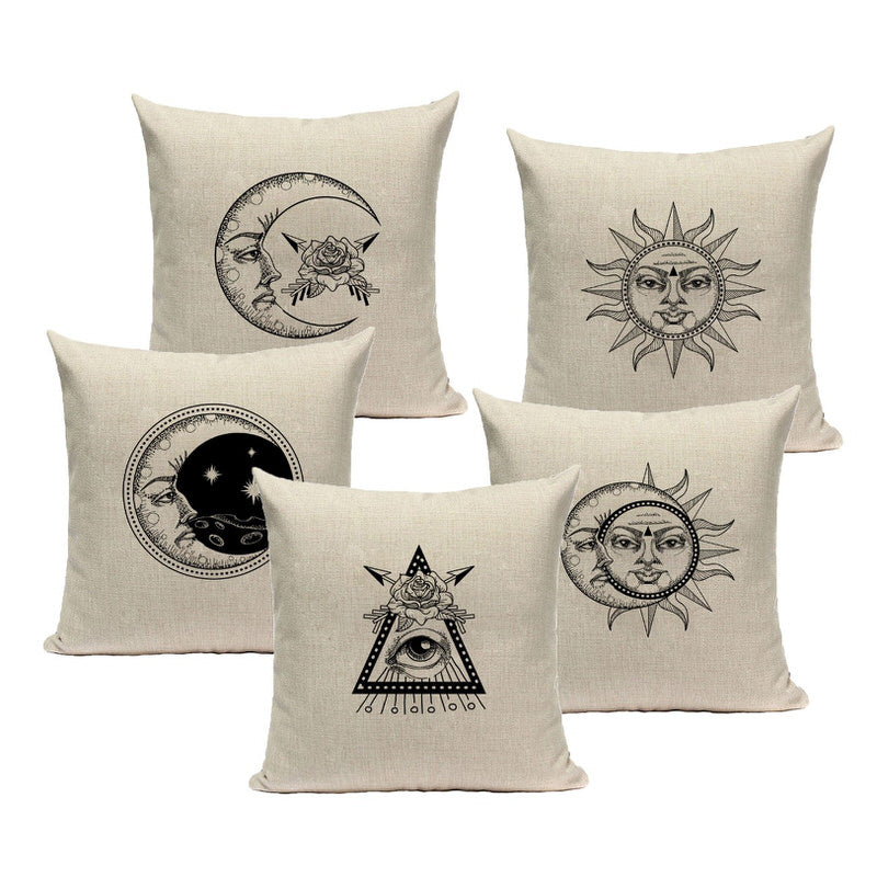 Astrologische Kollektion ästhetischer Kissenbezüge. Monochromer einseitiger Druck mit Vintage-Sonnen- und Mondmotiven. Perfekt für Hexen-, Feen- oder Astrologie-Raumästhetik.