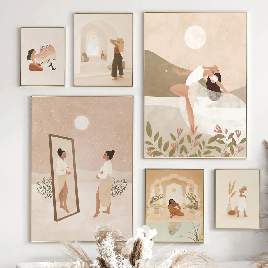 Auffällige und stimmungsvolle Wandkunstdrucke im Boho-Stil. Diese Boho-Postercollage mit marokkanischen Boho-Mädchen in Sandlandschaften eignet sich perfekt zur Dekoration von Zimmerwänden im Boho- oder Soft-Girl-Stil.