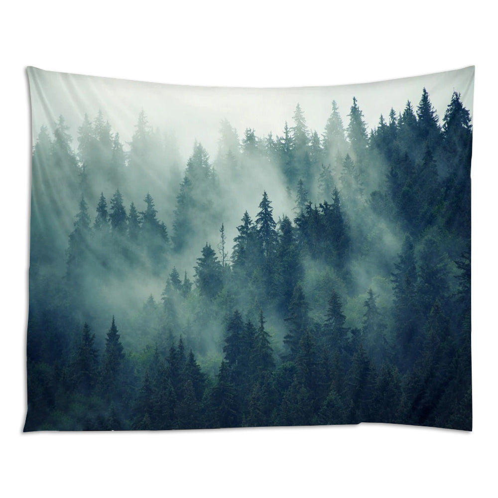 Wandteppich mit nebligem nordischem Walddruck. Erhältlich in extragroßen Größen.