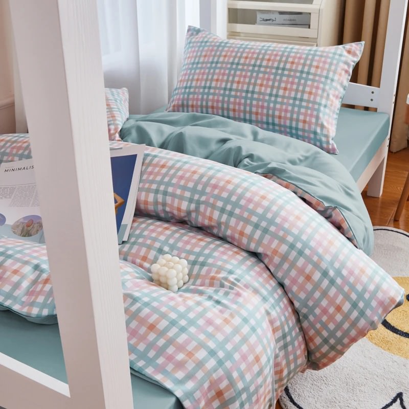 Bettwäsche-Set mit Karomuster in Pastellblautönen: Bettbezug + Bettlaken + Kissenbezug. Superweich auf der Haut. Pflegeleicht und bügelfrei ! Erhältlich in Einheitsgröße, perfekt für Betten im Studentenwohnheim. Perfekt für einen Hauch von (dänischem) Pastell. Kawaii- oder Soft-Girl-Ästhetik.