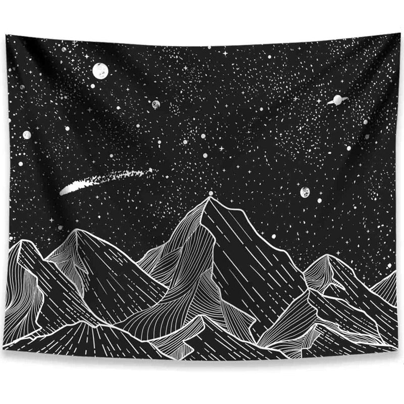 Schwarz-weißer Umrissdruck von Bergen vor einem sternenklaren Nachthimmel. Wandteppiche können Ihren Raumstil im Handumdrehen verändern! Leicht zum Aufhängen an Wand oder Decke und strapazierfähig für den Einsatz als Outdoor-Decke oder Tischdecke.