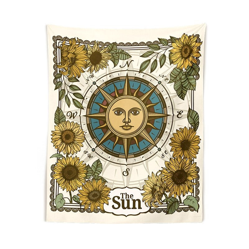 Ein Wandteppich in Form einer Windrose im antiken Stil mit Sonnenblumen im Hintergrund. Verwenden Sie ihn als Bettdecke, Decken- oder Wandbehang. Perfekt für Boho-/Hexen-Raumdekor.