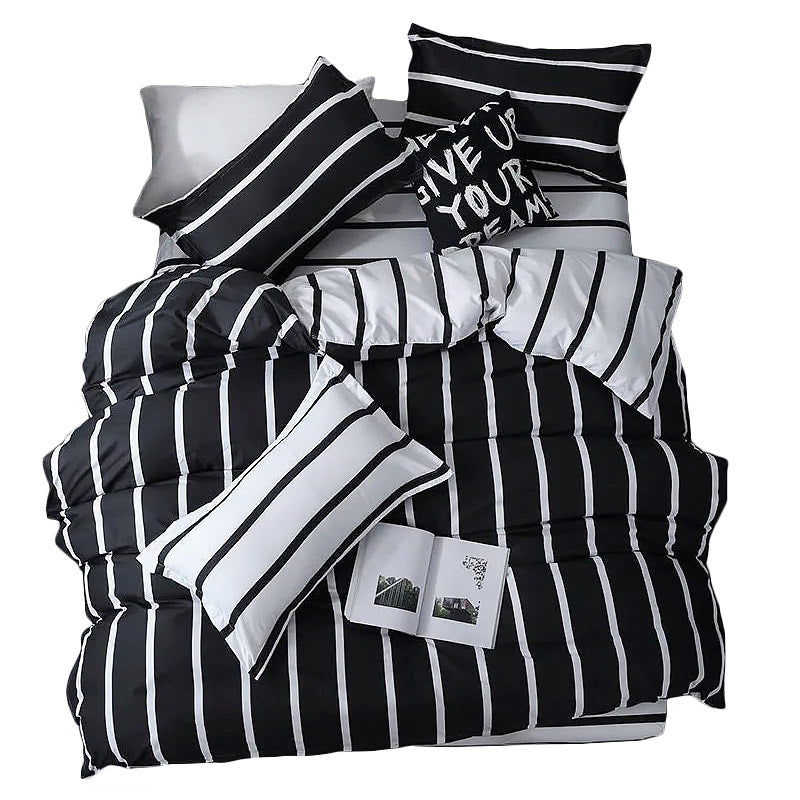 Donnez une nouvelle dimension à votre chambre avec cette parure de lit à rayures minimalistes et noires, aux tons simples et blancs. Simple et moderne, elle s'intégrera parfaitement à toutes les chambres de style grunge/indie et autres.
