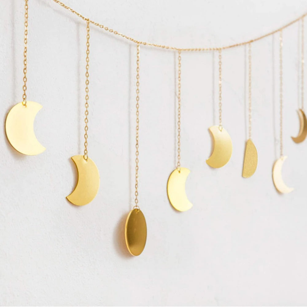 Apportez une touche bohème douce à vos murs. 13 magnifiques pendentifs en métal doré avec guirlande de chaîne en or de haute qualité montrant les phases de la lune.