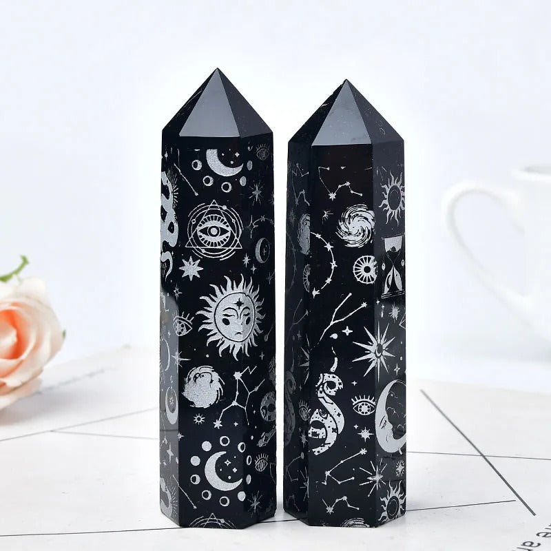 Placez ce magnifique cristal hexagonal sur votre étagère ou votre bureau pour ajouter une touche de magie pure à votre pièce. Ce cristal d'obsidienne noire naturelle, orné d'un motif de lune et d'étoiles ensorceleuses, sera parfait pour les pièces d'inspiration sorcière ou féerique.