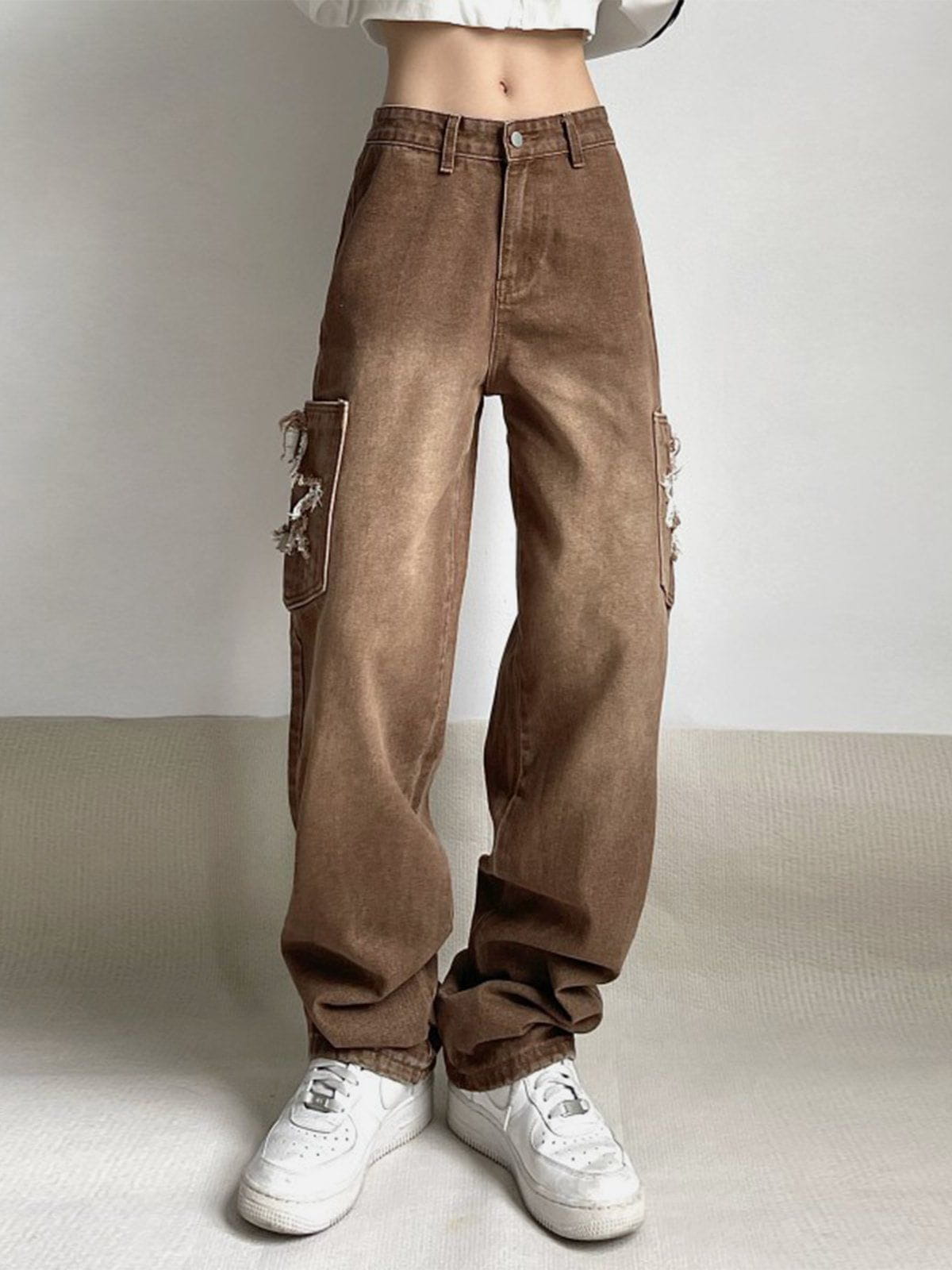 Jean évasé taille basse avec patch déchiré