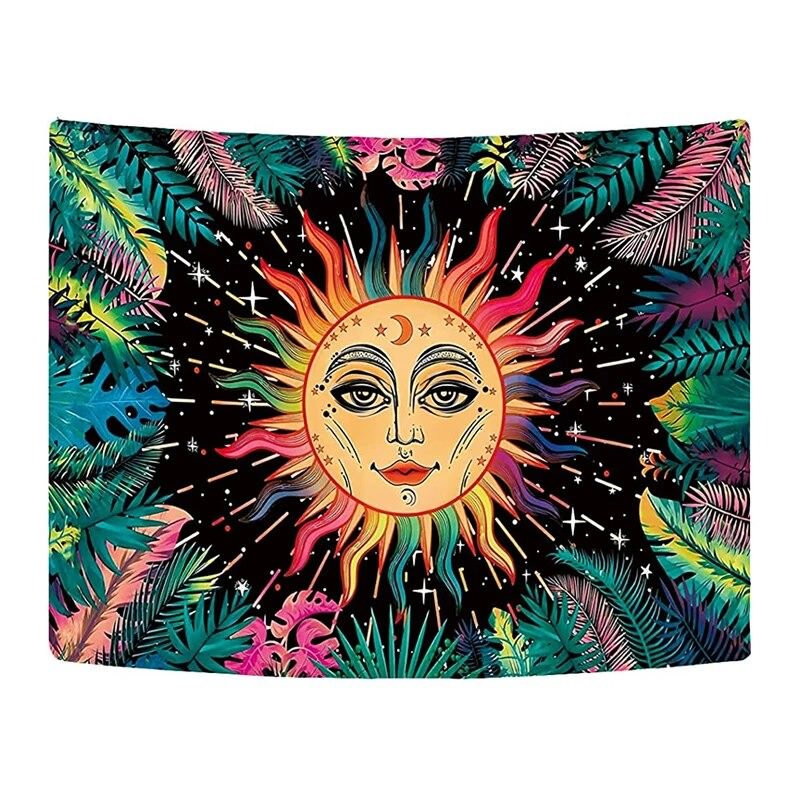 Indian style burning smiling female sun in tropical leaves print tapestry. Wall tapestries truly can change your room style in just a minute! Lightweight to hang on the wall or ceiling and durable to use as outdoor blanket or tablecloth.