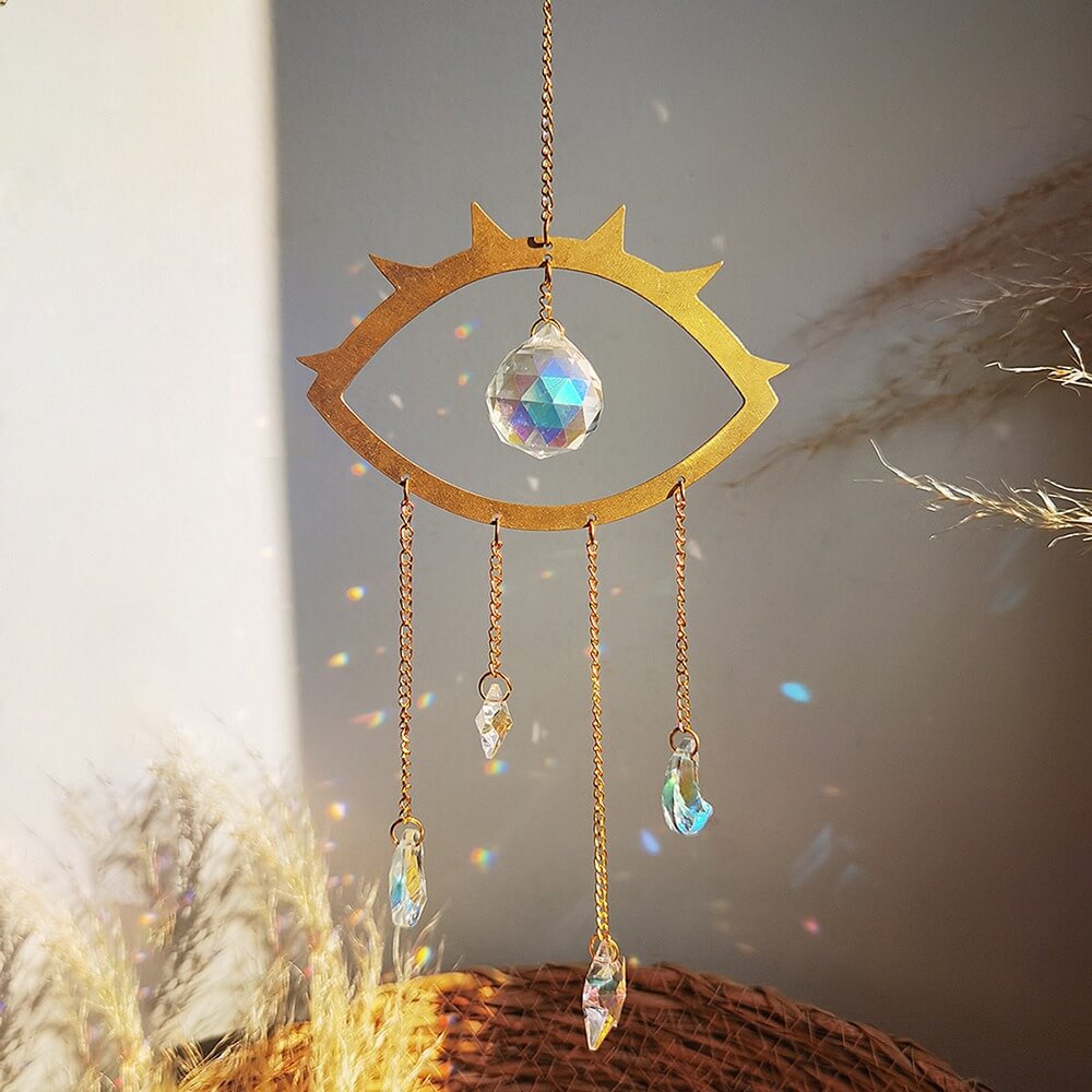 Eye shaped gold metal framed sun catcher decorated with glass crystal pendants. Hang this beauty in a well sunlit area near the window and enjoy your room filled with fairy lights!