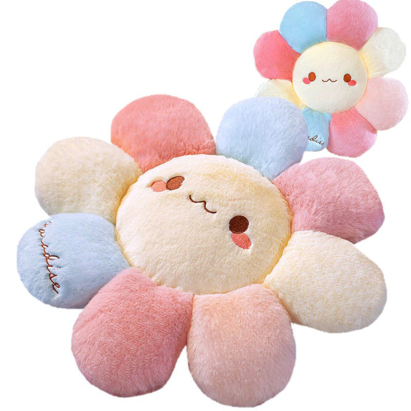 Soft and fluffy flower throw pillow with embroidered kawaii face. Throw it on your bed or use it as a seat cushion for your chair. A must have for soft/pastel aesthetic room.