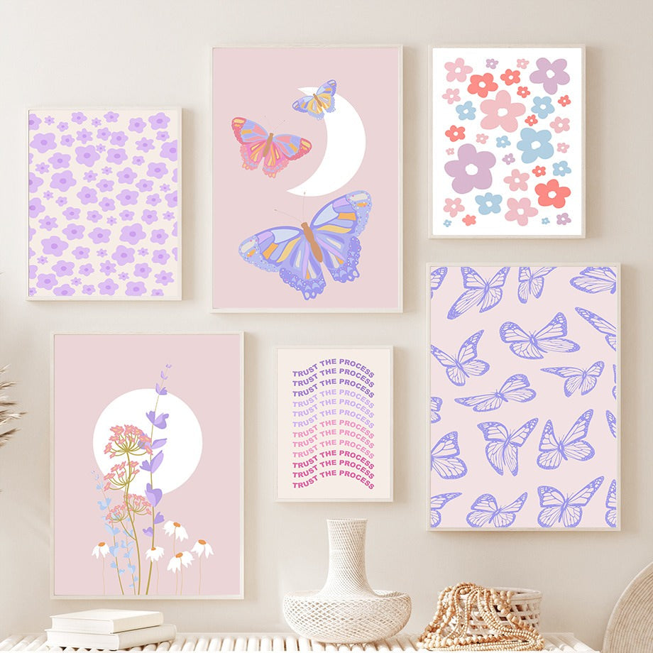Gentle pastel touch to your walls with soft purple flowers and butterflies canvas wall art. Perfectly fits any danish pastel or soft girl room and also will look great along with pink aesthetic wall decor.