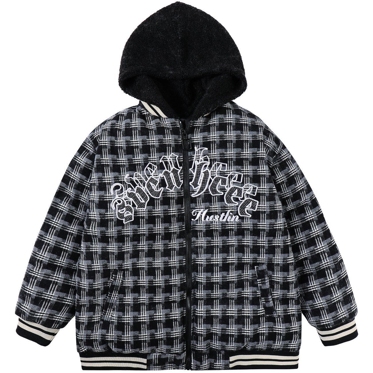 Plaid Patchwork Embroidery Hooded Winter Coat