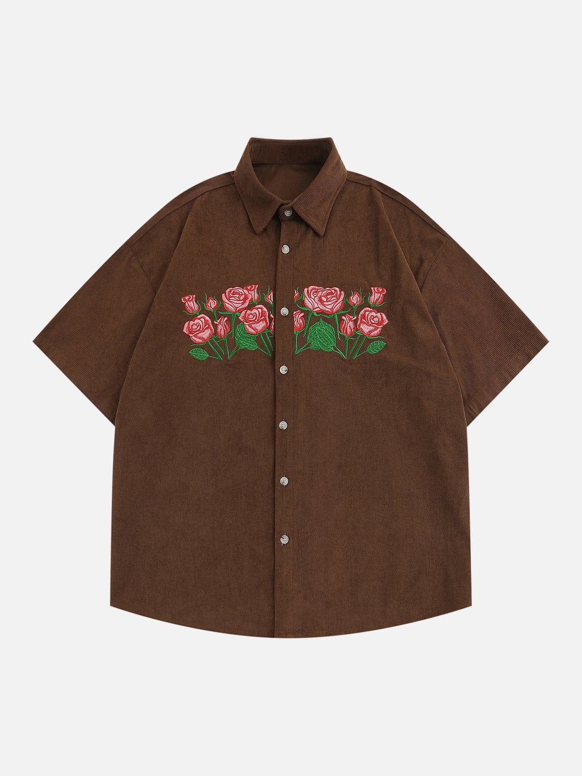 Rose Embroidered Corduroy Short Sleeve Shirts