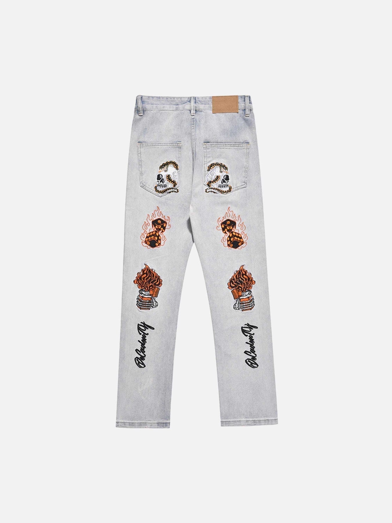 Skull Flame Monogram Embroidered Slim Fit Jeans
