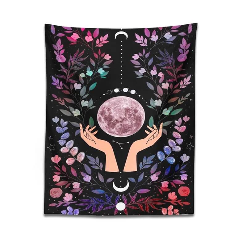 Floral print "The Moon in the Hands" aesthetic wall hanging tapestry. Perfect for hanging on ceiling over the bed. Wall tapestries truly can change your room style in just a minute! Lightweight to hang on the wall or ceiling and durable to use as outdoor blanket or tablecloth.