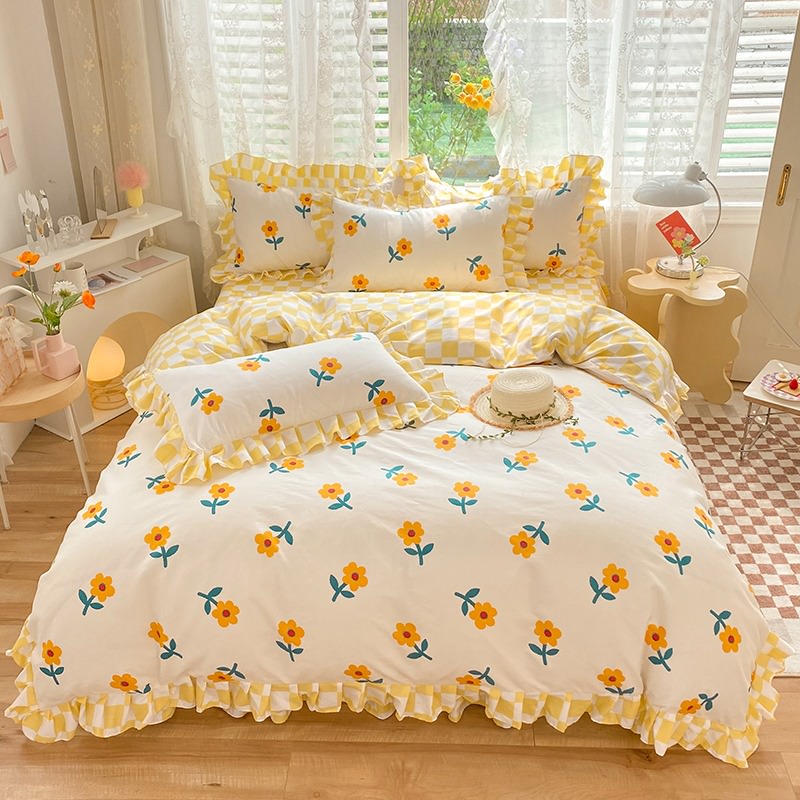 Aesthetic bedding set with cute yellow flowers print on top of duvet and pillows cover and bright yellow checker print on the other side. Lush ruffles and bright colors make it perfect fit for kawaii. kidcore. soft girl and many other aesthetics.